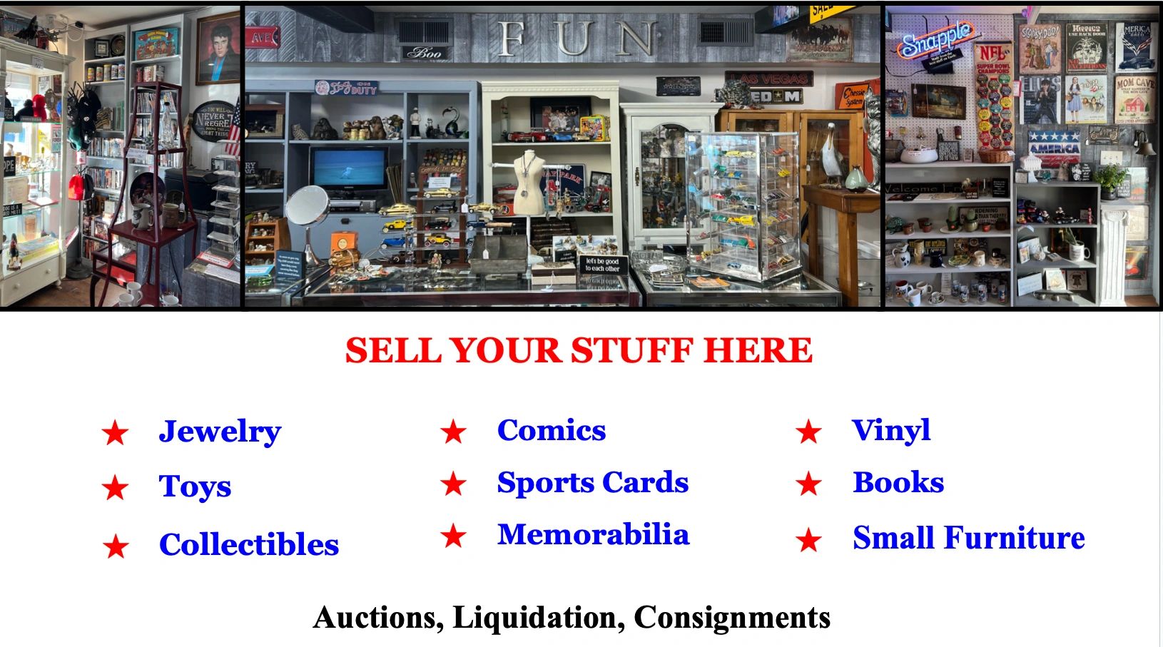 Come sell your items here! We buy outright or take items on consignment depending on what they are. We are currently looking for jewelry, coins, vinyl, toys, sports cards/memorabilia, and collectibles! Make an appointment by calling and we'll check your items out!